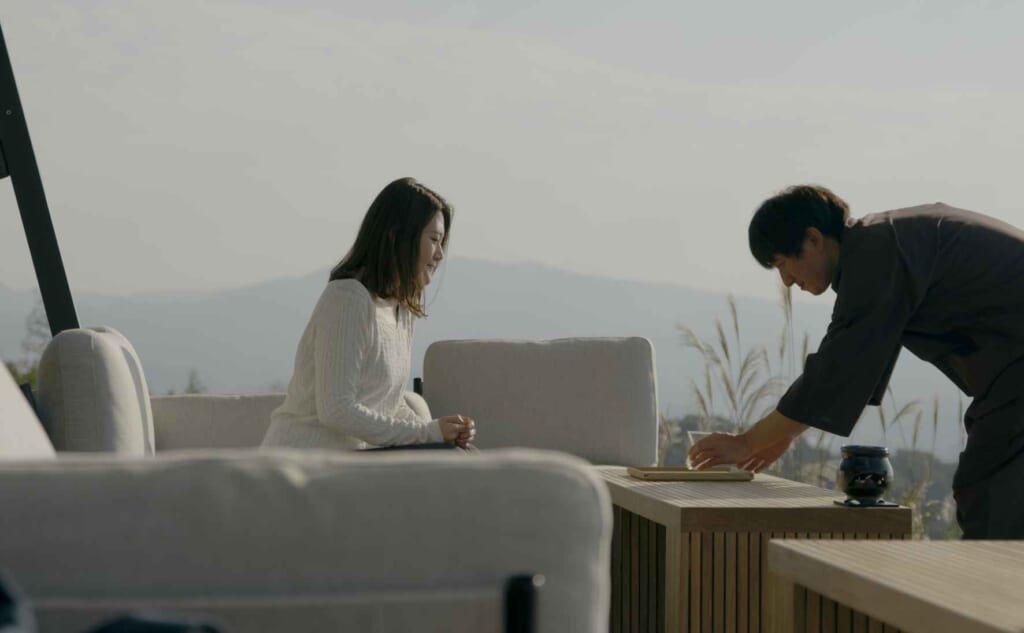 茶園の絶景を一望できる特等席で、茶師との対話を楽しむ。