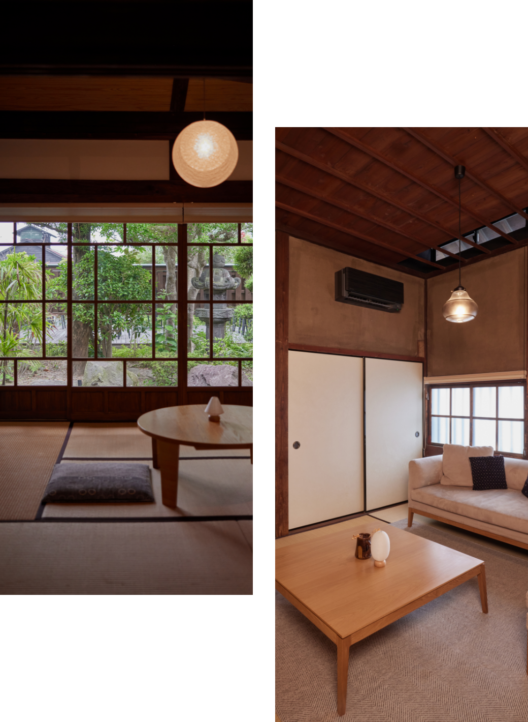 山紫水明の地「八女」に創業して約200年を迎える老舗蔵元のひとつ「喜多屋」。当時の窓枠やガラス、梁はなるべくそのままに修繕をし、フロントとレストラン機能を備えた3室の客室として生まれ変わりました。併設のバーでは、蔵元・喜多屋の日本酒や本格焼酎を楽しむことが出来ます。